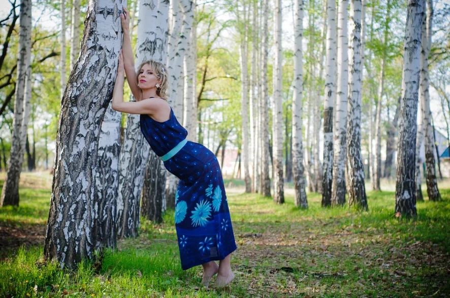 A woman is just walking, in a blue dress, in stockings, through the spring forest ....