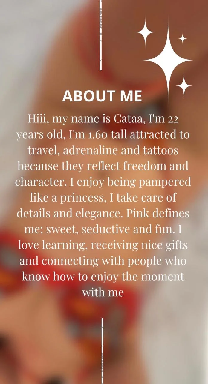 I am a feminine and magnetic woman, a lover of sensations that awaken the senses. I am drawn to travel, adrenaline, and tattoos, because they speak of freedom and character. I enjoy being pampered and treated like a princess; I value cleanliness, attention to detail, and good taste. My favorite color is pink; it reflects my sweet and seductive side. I like to have fun, learn new things, receive thoughtful gifts, and meet people with whom I can connect, flow, and enjoy the moment.