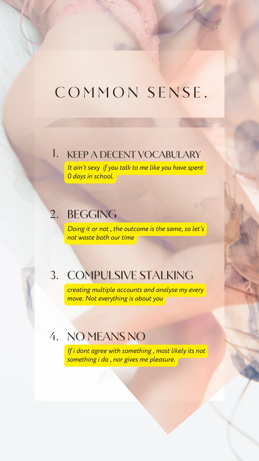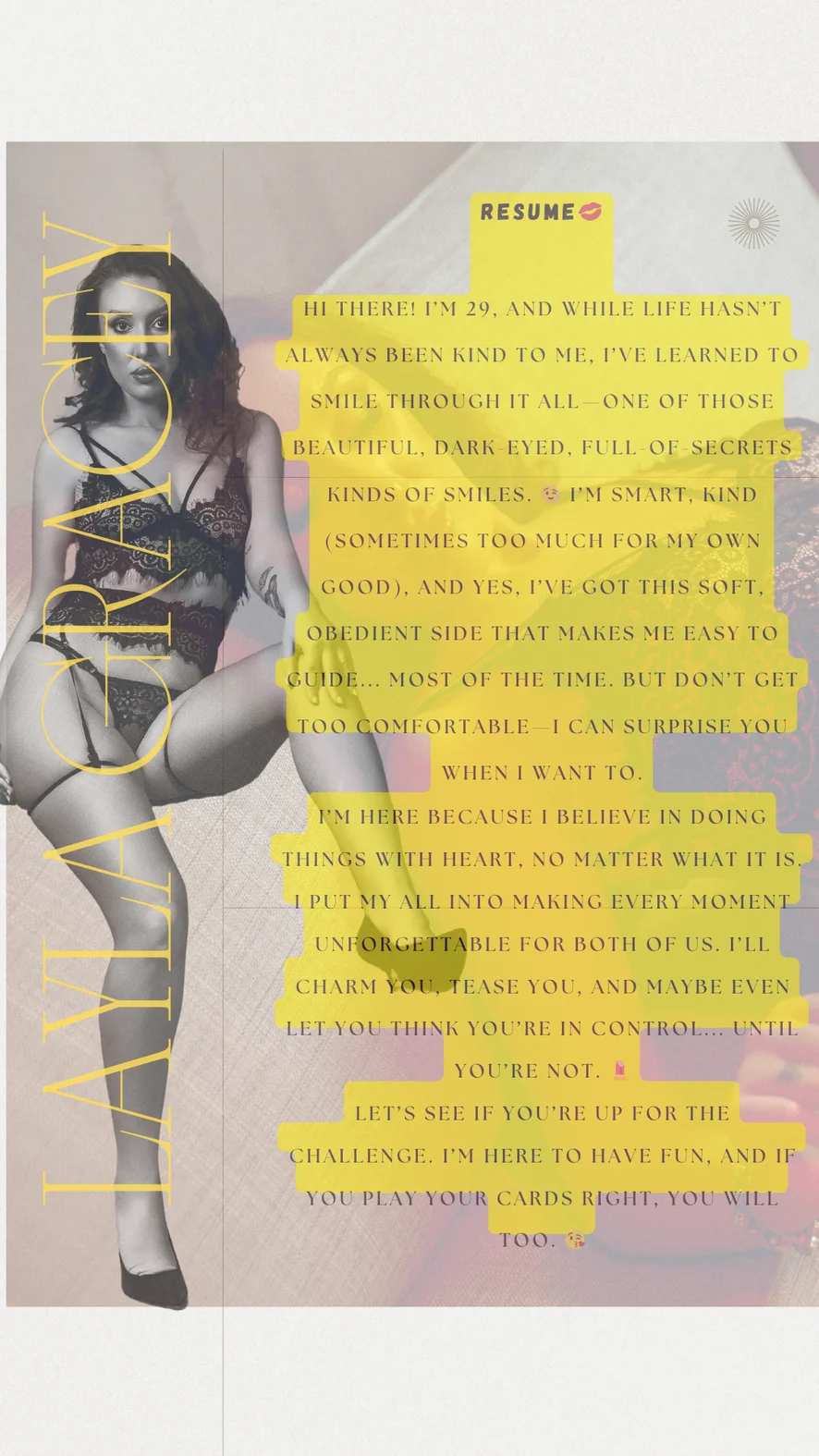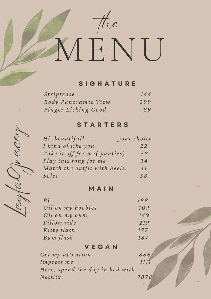 Blowjob, Camel Toe, Doggy Style, Erotic Dance, Fingering, Flashing, Foot Fetish, Masturbation, Orgasm, Spanking, Striptease, Upskirt, Twerk, Topless, Anal, Cowgirl, Dildo or Vibrator, Dirty Talk, Humiliation, Heels, Sex Toys, Role Play, Squirt, Double Penetration, Smoking, Ahegao, Cuckold, Jerk-off Instruction, Mistress, Tittyfuck, Anal Toys, Deepthroat, Facesitting, Yoga, Hardcore