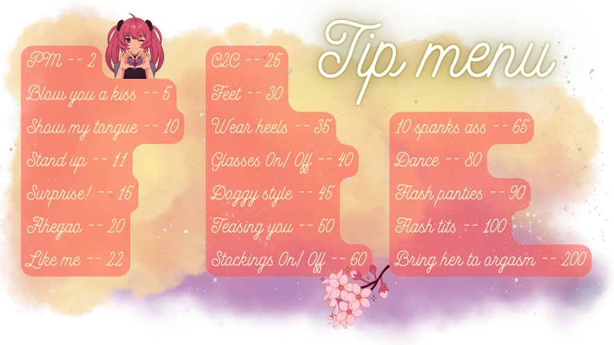 Erotic Dance, Twerk, Ahegao, Upskirt, Striptease, Dirty Talk, Blowjob, Tittyfuck, Spanking, Doggy Style, Sex Toys, Topless