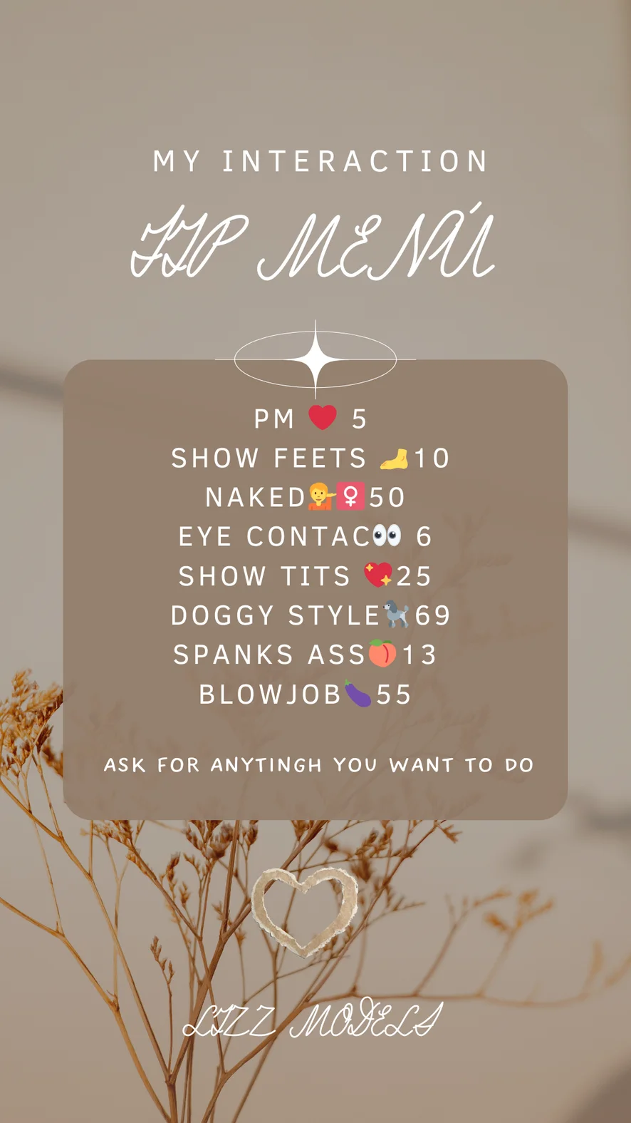 Doggy Style, Spanking, Erotic Dance, Camel Toe, Striptease, Office, Nylon, Heels, Topless, Twerk, Upskirt, Cowgirl, Yoga, Oil Show, Smoking, Ahegao, Leather, Fingering, Dildo or Vibrator, Dirty Talk, Double Penetration, Facial, Foot Fetish, Fisting, Flashing, Deepthroat, Jerk-off Instruction, Role Play, Sex Toys, Tittyfuck, Anal, Hardcore, Handjob, Orgasm, Pegging, Squirt, Humiliation, Anal Toys, Shower, Cock Rating