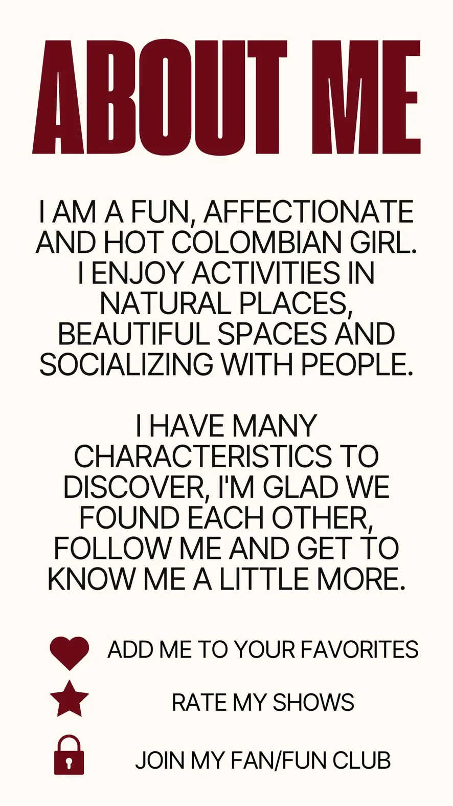 Doggy Style, Ahegao, Spanking, Camel Toe, Topless, Erotic Dance, Cock Rating, Fingering, Facesitting, Blowjob, Tittyfuck, Oil Show, Cowgirl, Dildo or Vibrator, Shower, Striptease, Masturbation, Hardcore, Twerk